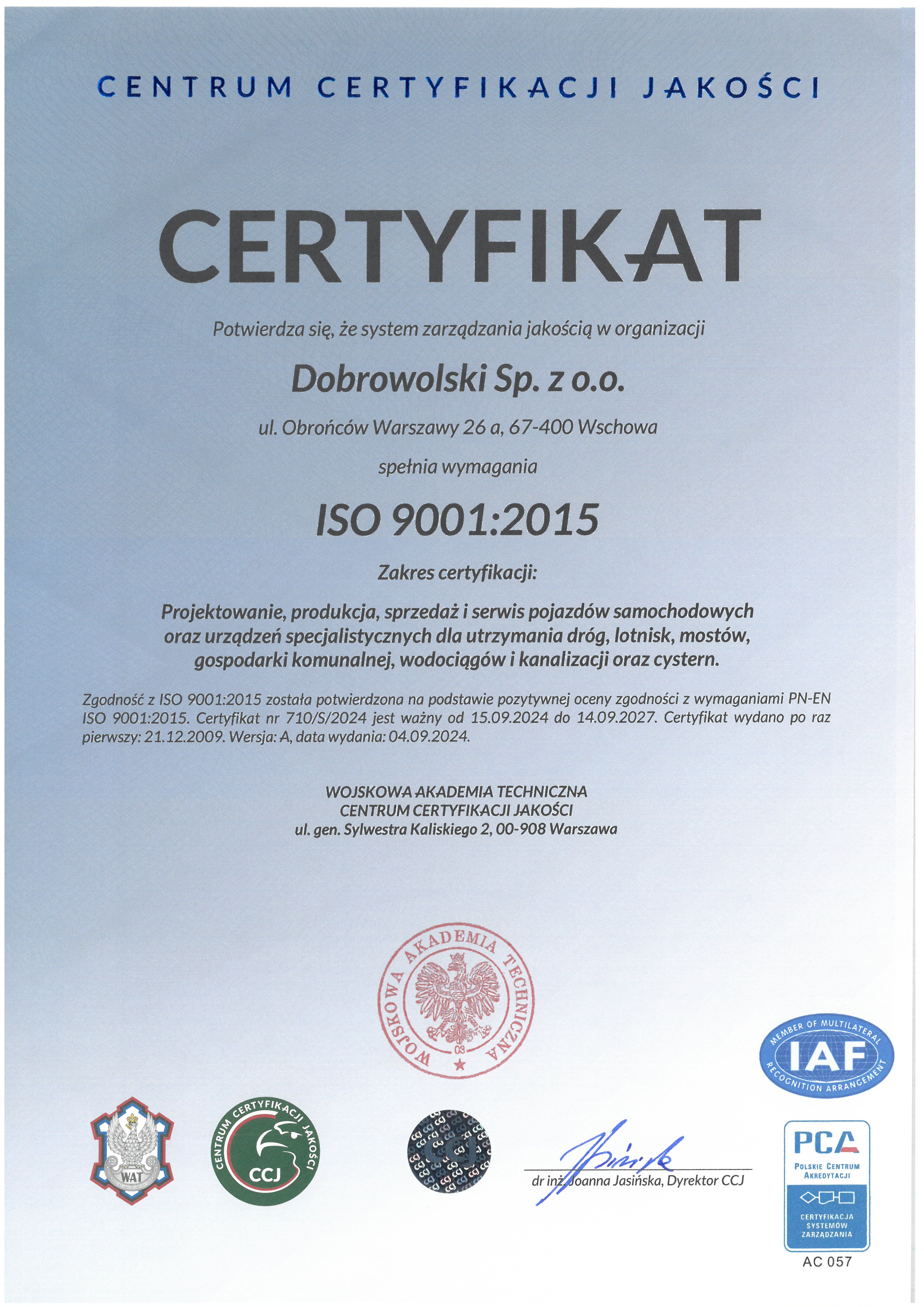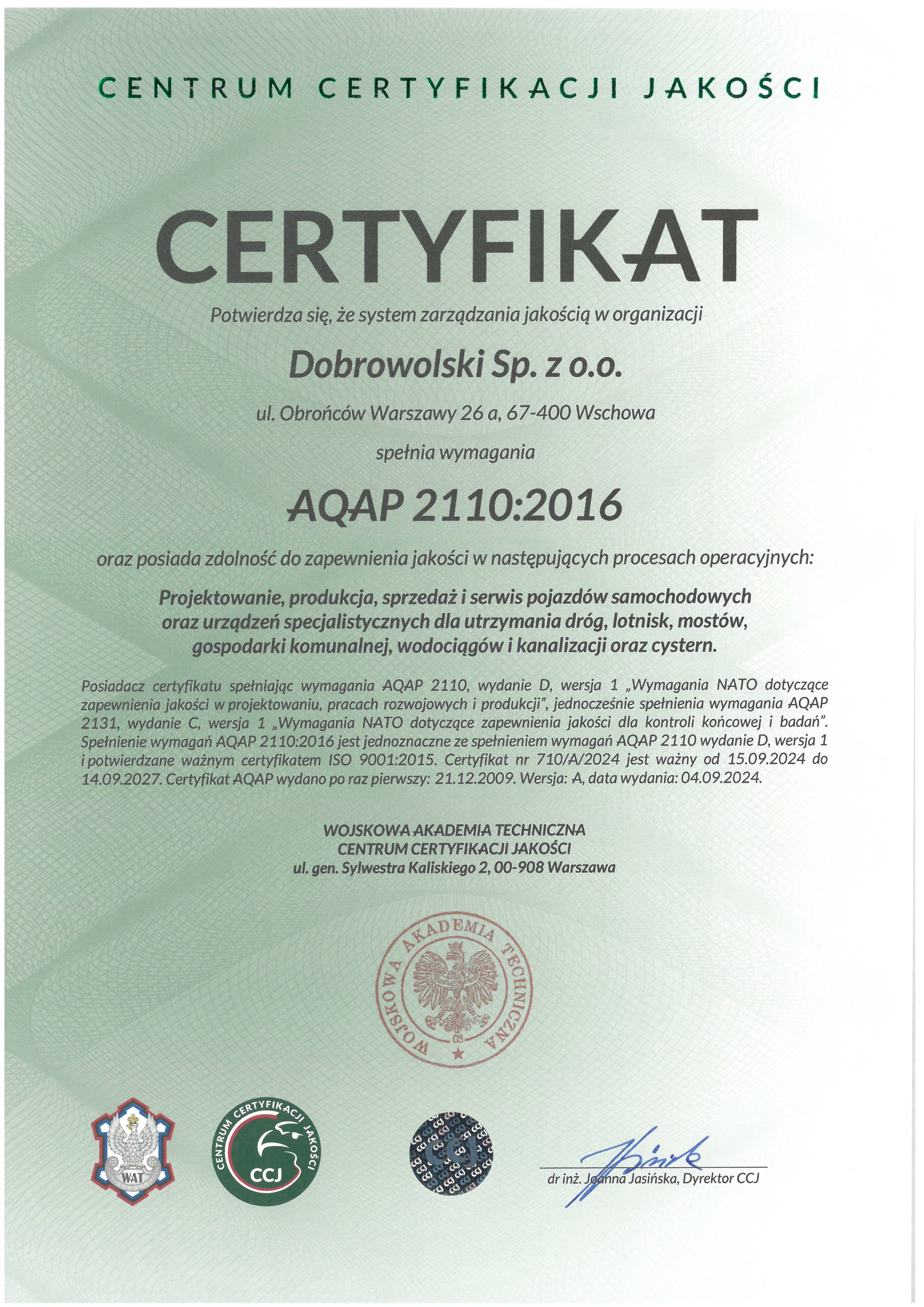Dobrowolski Sp. z o.o. funkcjonuje zgodnie z wymaganiami stawianymi przez System Zarządzania Jakością i posiada certyfikat ISO 9001:2015 oraz AQAP 2110:2016 w zakresie projektowania, produkcji, sprzedaży i serwisu pojazdów samochodowych oraz urządzeń specjalistycznych dla utrzymania dróg, lotnisk, mostów, gospodarki komunalnej, wodociągów i kanalizacji oraz cystern.